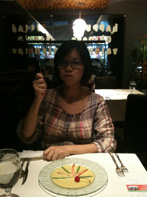 西堤........我星期三中午聚餐才吃哩,而且,星期六晚上會有位置嗎? 而且我肚子也不餓哩! 沒想到竟然還是有二個人的位置,只是位置很小、走道很擠,我們兩個很厚臉皮的只點了一份套餐....而且組合跟我星期三中午的內容大同小異:鮮蝦蘆筍、焗烤蘑菇+麵包、蘿美生菜沙拉、南瓜濃湯..不同的是:酥烤牛排、雪沁藍澄、巧克力袋冰淇淋.....